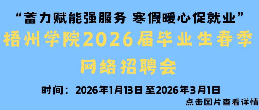 2026年01月18日各二级学院:为贯彻落实国家教育部、教育厅关于做好普通高校大学毕业生就业工作的指示精神,积极主动做好我校毕业生就业推荐工作,拟于定于2026年1月22日至3月1日开展“蓄力赋能强服务 寒假暖心促就业”梧州学院2026届毕业生春季网络招聘会,现将有关事项通知如下:一、时间、形式时间:2026年1月22日至3月1日形式:网络招聘二、举办单位主办单位:梧州学院广西壮族自治区人力资源和社会保障厅协办单位:广西壮族自治区就业服务中心广西壮族自治区人才服务中心梧州市人力资源和社会保障局梧州学院筑梦职业发展工作室 ...