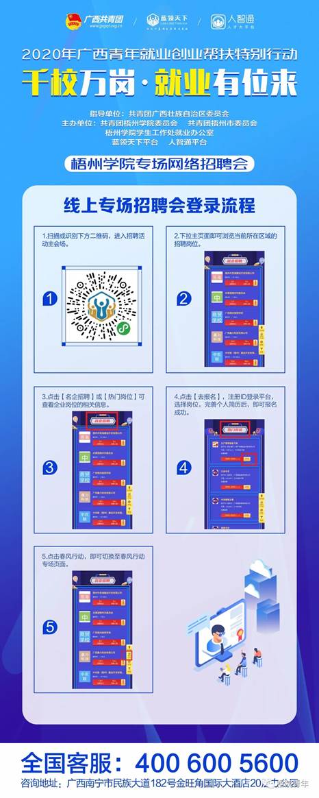 2020年4月1日,在广西团区委指导下,共青团梧州学院委员会、共青团梧州市委员会、梧州学院学生工作处就业办公室携手蓝领天下平台、人智通平台共同举办“千校万岗·就业有位来”线上招聘会梧州学院招聘专场,面向梧州学院应届毕业生提供充足的就业岗位及良好的创业机会。