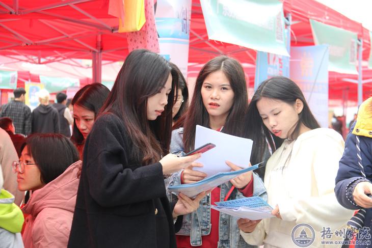 深圳链家房地产经纪有限公司每年都会到我校招聘,其企业代表张聪提到,企业会更倾向于敢于挑战、有上进心的毕业生。她建议应届毕业生应该多走走,开阔视野。她说:“在今早上的交谈过程中,我觉得梧州学院的应届生积极主动、有热情。即使在餐点时间,招聘会现场仍很热闹。”