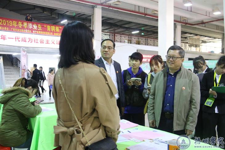 11月30日上午,由学校与广西毕业生就业促进会联合举办的2019年冬季毕业生“青聘果”智能招聘会在学校体育馆举行。学校校长杨奔到现场了解学校毕业生就业工作情况,并与招聘用人单位代表交流,了解毕业生的就业质量、供需等现状。