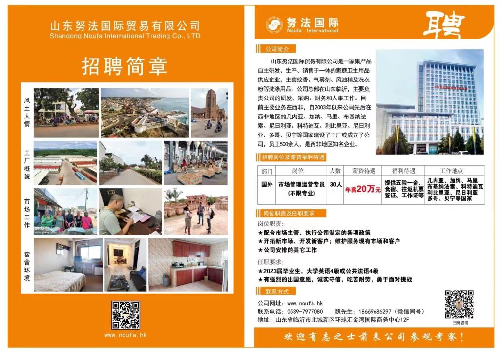 山东努法国际贸易有限公司是一家集产品自主研发、生产、销售于一体的家庭卫生用品供应企业,主营蚊香、气雾剂、风油精及洗衣粉等洗涤用品。公司总部在山东临沂,主要负责公司的研发、采购、财务和人事工作。目前主要业务在西非,自2003年以来公司先后在西非地区的几内亚、加纳、马里、布基纳法索、尼日利亚、科特迪瓦、利比里亚、尼日利亚、多哥、贝宁等国家建设了工厂或成立了公司,员工500余人,是西非地区知名企业。