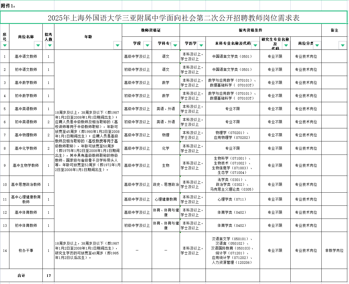 附件1:2025年上海外国语大学三亚附属中学面向社会第二次公开招聘教师岗位需求表
