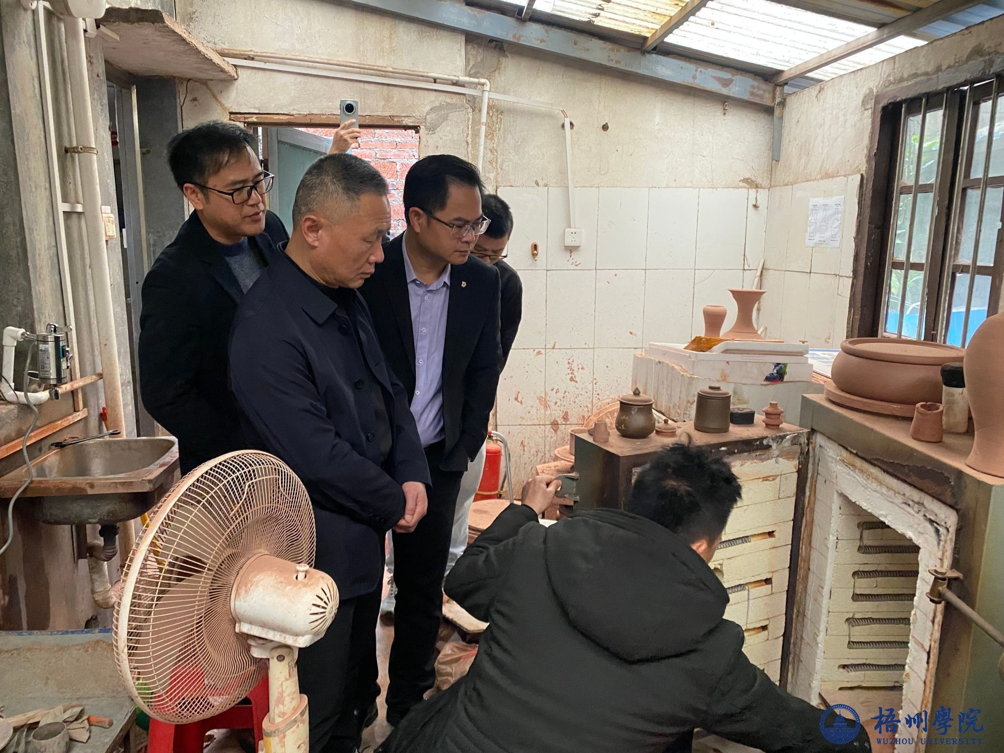 在坭阜兴陶茶文化有限公司,调研团队深入坭兴陶制作车间及产品展示区,了解非遗技艺传承、茶陶融合发展及文旅产业创新情况。企业负责人、校友胡欢文分享创业历程与企业发展规划,表达对母校人才培养的认可与合作意愿。覃雄彪副校长表示,坭兴陶与茶文化是广西特色文化产业,与我校艺术设计、旅游管理等专业高度契合,期待校企携手,在非遗传承、文创开发、实践教学、毕业生就业等方面深度合作,助力地方特色产业高质量发展,同时为学生搭建更广阔的就业创业平台。